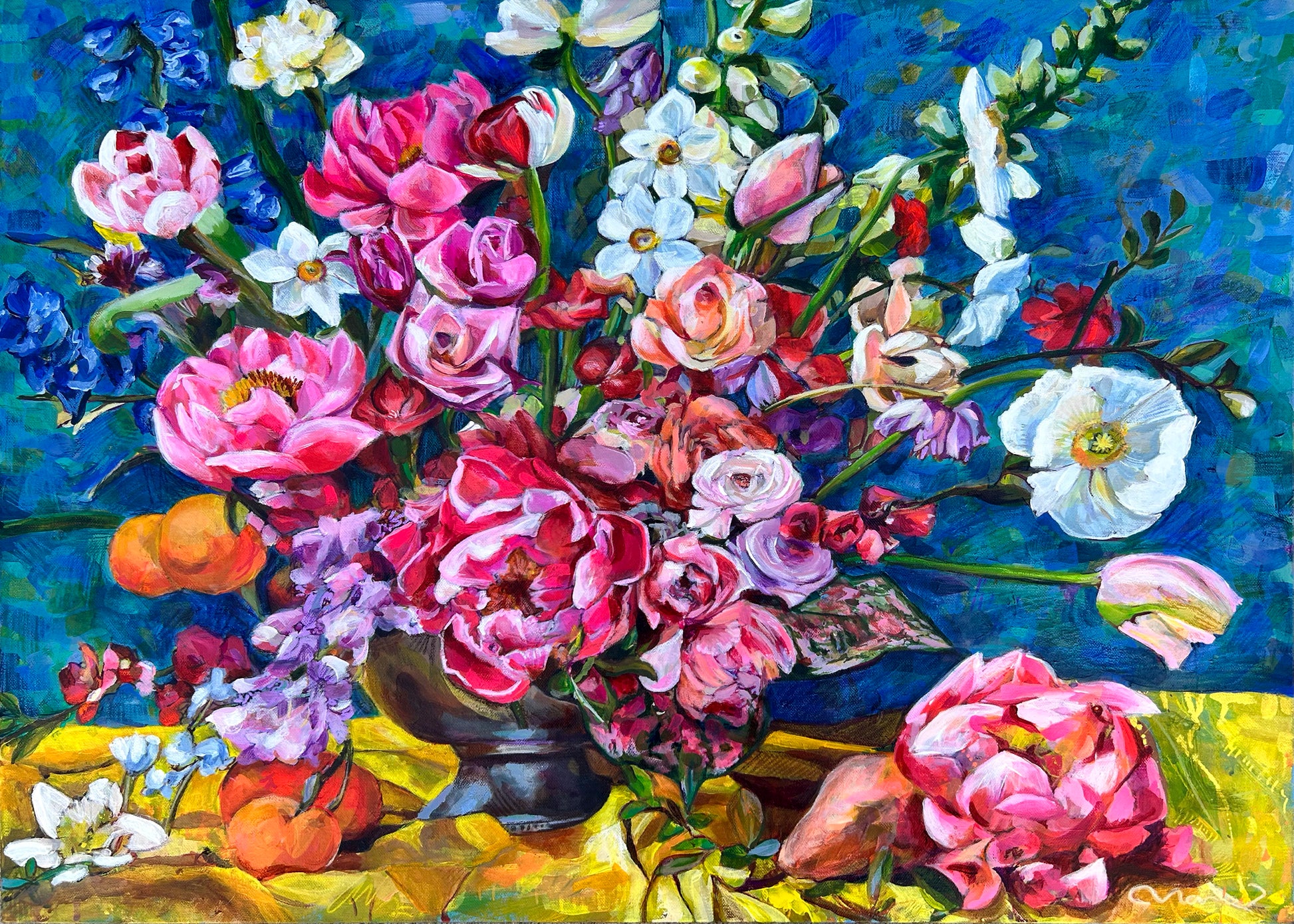 Abundance is a splash of joy brought to life through vibrant acrylic paints dancing across a generous canvas! This original artwork measures a delightful 24 x 30 x 1.5 inches—big enough to make a statement but not so huge it'll take over your entire wall (unless you want it to!).